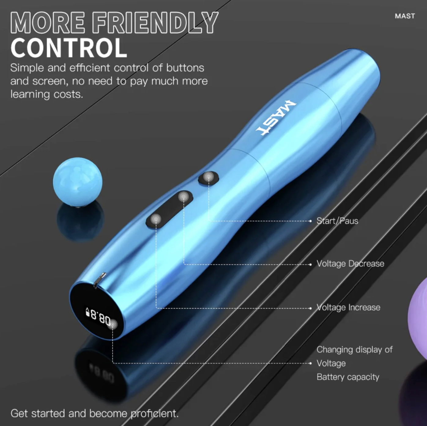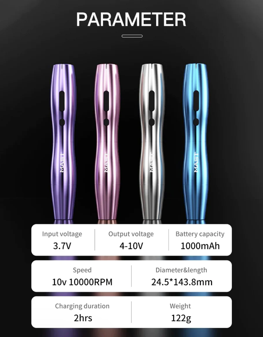 Mast P20 voor permanente make-up is een superslanke draadloze penstijl machine met een batterij die lang meegaat en een ergonomische behuizing.